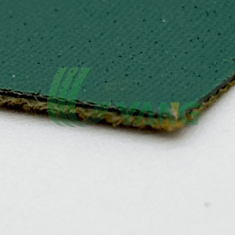 This belt features a green high-friction fabric working surface combined with a yellow reinforced fabric core, delivering balanced traction, dimensional stability, and smooth operation in continuous industrial environments.